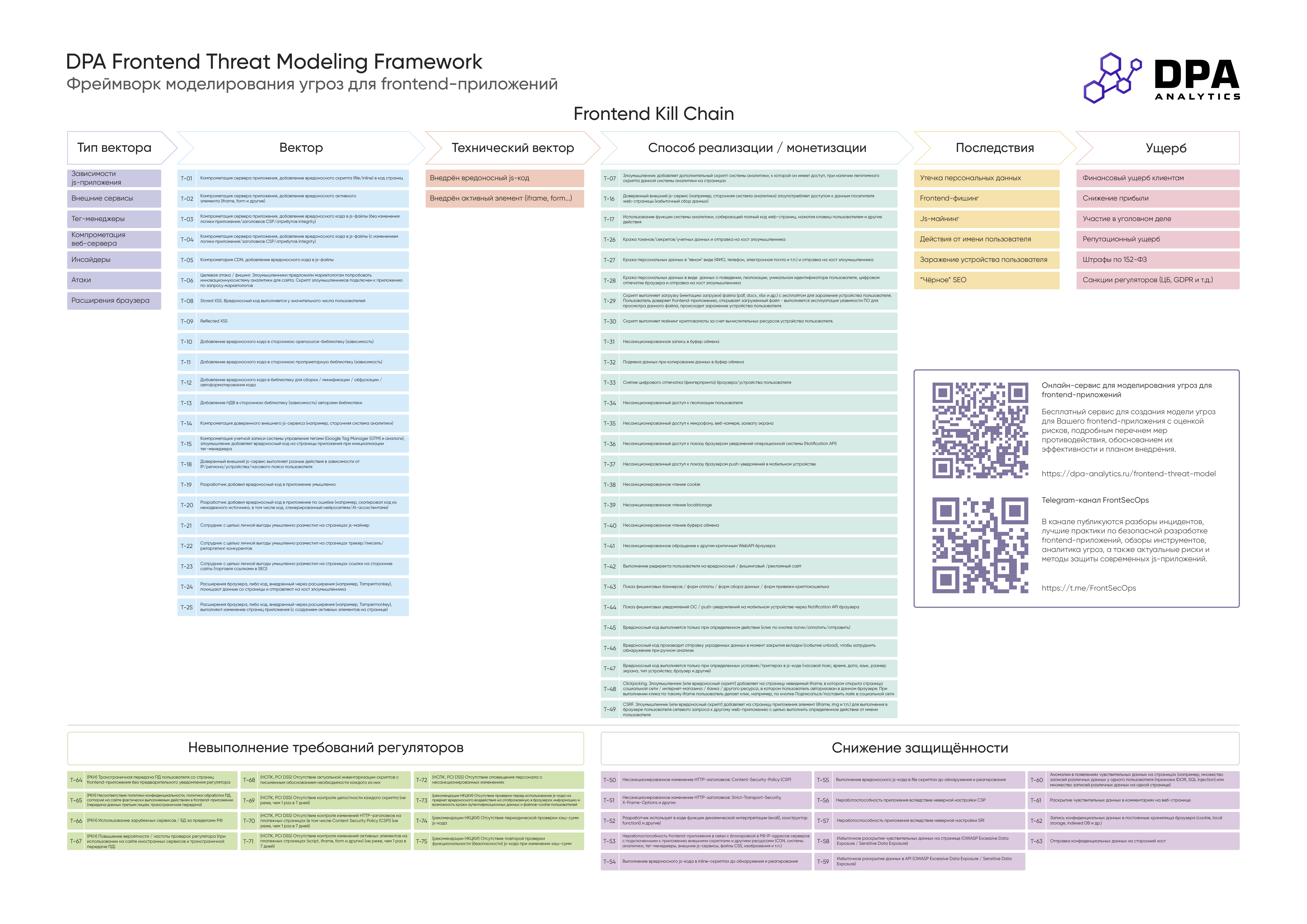 Онлайн-сервис для создания модели угроз для frontend-приложений основан на фреймворке моделирования угроз DPA Analytics (DPA Frontend Threat Modeling Framework), построенным по принципу Frontend Kill Chain. Описание фреймворка и основные сущности были представлены Михаилом Парфеновым в докладе на PHDays 2025 (https://t.me/FrontSecOps/57).